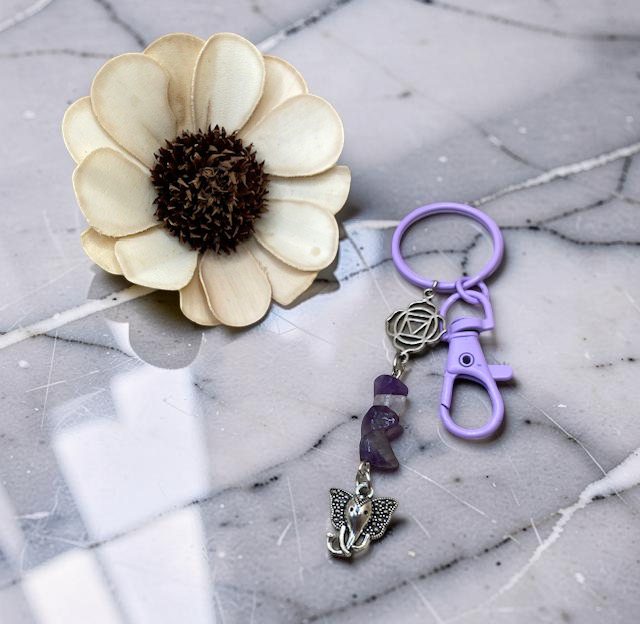 Ce porte-clés en chips d'améthyste séduit par ses nuances violettes profondes et raffinées. Elégant et lumineux, il apporte une touche de douceur et de caractère à votre trousseau de clés ou à votre sac.